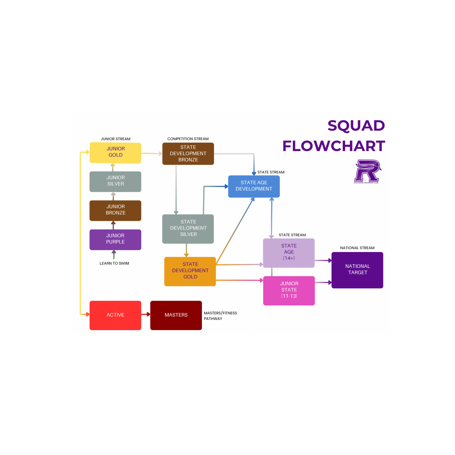 Ringwood Swimming Club offers a structured squad system designed to support swimmers at every stage of their development — from foundational technique through to national-level performance. Whether you're focused on fitness, racing for fun, or aiming for elite competition, our flowchart below shows the clear pathways available through our Junior, Competitive, State, and National streams. Use the chart to find your best fit, then explore each squad in more detail using the links below.